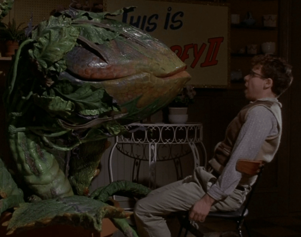 From there, director Frank Oz (known for his puppetry work on The Muppets and as Yoda in multiple Star Wars movies, as well as a lengthy and generally solid directorial career across several genres) builds a lavish paean to B-movies, several genres of music, and ’50s nostalgia. The sets are a significant point in the film’s favor, with the large, very movie set-looking backdrop for the “Skid Row” sequence being a particular highlight. This article from the AV Club is dedicated to this number and really gets at the nuts and bolts of what makes it such a soaring scene, so I definitely think it’s worth a read. But generally, between this and the legitimately rousing “Suddenly, Seymour”, Oz gives us all a clinic on how to stage a musical number. Staging is a key, underrated element to the success of any dynamic set piece. It’s the reason why the action scenes in The Dark Knight are so much more memorable than the ones in Batman Begins, and it’s also one of the main reasons why Michael Myers is so much more unsettlingly terrifying when directed by John Carpenter than any of the other schmos who’ve directed Halloween movies. Here, it’s one of many elements that send this movie to another level. As I said before, I struggle to definitively name a favorite track from this movie, with that struggle most often coming down to these two. The strength of the songs themselves, the vocal work from the cast, and Oz’s directorial brilliance are all inseparable for me, as even hearing the songs with no visuals will always call to mind the bit in “Skid Row” where the people in the street all stop and sing in unison, or the quick editing of its coda that leads up to Seymour and Audrey converging on the same street corner to belt the final line, or the shot in “Suddenly, Seymour” where The Greek Chorus singers are introduced on the balcony over Seymour’s shoulder, or his quick “Yes, you can!” rush up the stairs to join Audrey for the finale. This is all A+, gold star work, and I haven’t even mentioned the plant yet.