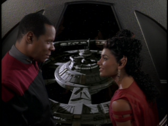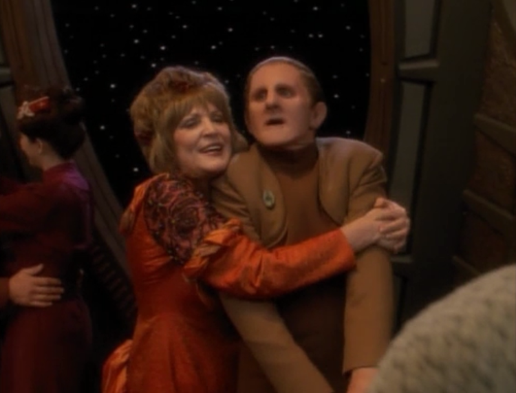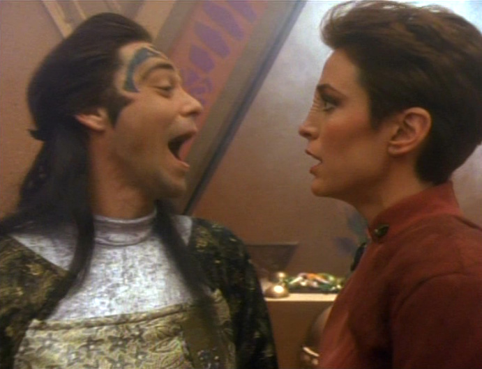 Speaking of farce, “Fascination” is about as old-school a farce as DS9 ever attempted, and the results are mixed. Avery Brooks (Capt. Sisko) directs this episode rather well, his third directorial effort of the series. The orchestrated chaos that breaks out at Sisko’s party at the end is well-staged, and the episode maintains a sense of energy that “Ferengi Love Songs” doesn’t. The explanation for why everybody’s suddenly deeply in love with somebody random is pretty damn silly, but I’m generally OK with this episode. Nana Visitor, Terry Farrell, and Rosalind Chao all get to wear much better clothes than most people in a Star Trek series are ever allowed to wear, and the Odo/Lwaxana relationship continues to work better than it should.