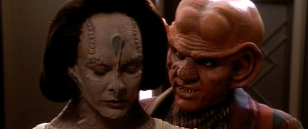 Trivial Note – An earthquake hit Southern California during the filming of this episode, and many of the actors went home while still in full makeup to check on family members. This had to really screw with at least one person’s head. Also, Mary Crosby, who plays Quark’s Cardassian love interest, is the daughter of Bing Crosby and the aunt of Denise Crosby, who played Tasha Yar on The Next Generation.