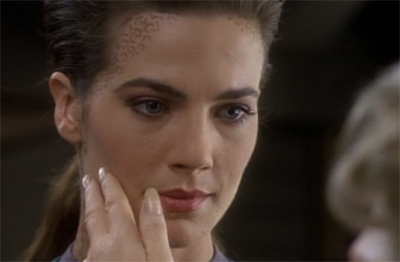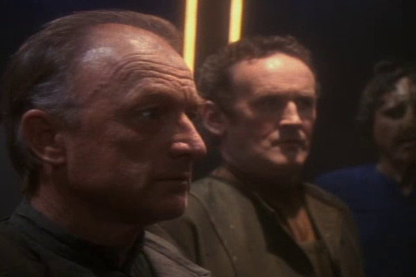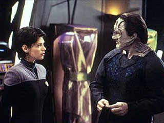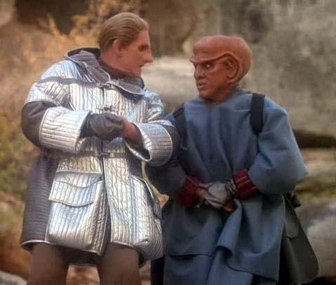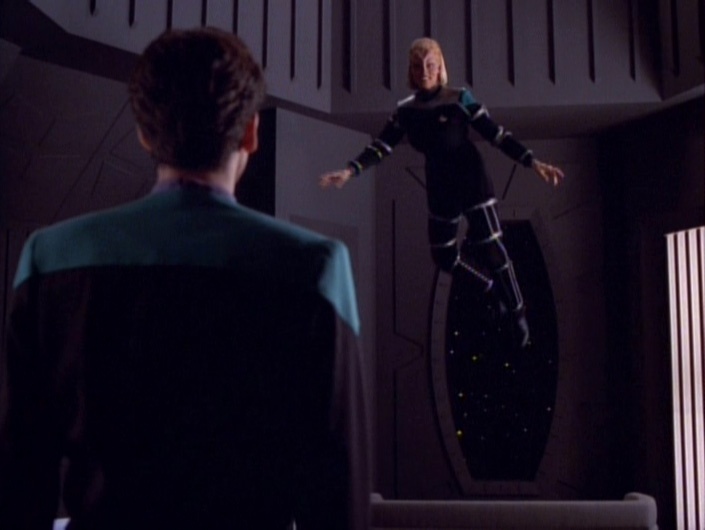 Trivial Note – The aforementioned creepy alien was played with impressive creepiness by Jeffrey Combs, in his first of many appearances on this show and Trek in general. He’s best known for appearing in the Re-Animator film series, and apparently came in second to Jonathan Frakes for the role of Cmdr. Riker on The Next Generation. Frakes directed this episode and recommended Combs for the creep part. Combs would return to play two more wonderful creeps, Brunt and Weyoun, for the rest of the show.