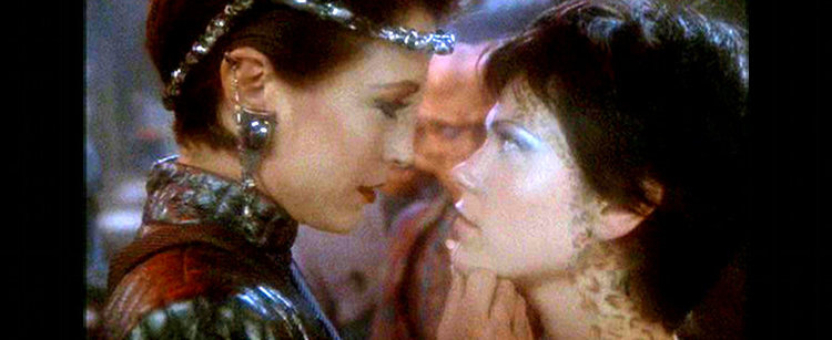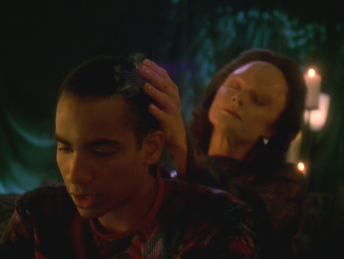 Such are the disadvantages of Star Trek‘s bloated 26-episode seasons (at least on this show and TNG) that even the best season of the series had this clunker in it. A quick look at the writing credits would make you think that Majel Barrett, widow of franchise creator Gene Roddenberry, had used her clout to get a lousy story made, but this isn’t entirely the problem. The story that featured Barrett as Lwaxana Troi isn’t great by any means, but it’s not completely objectionable. I actually liked the interplay between her and Odo in the three episodes they have together. Odo’s quote above is from his wedding speech (oh yeah, they get married in this episode, though it’s only for show), and it has real feeling behind it, given what we’d seen between those characters before. No, the problem here is the plot that gives the episode its title. Meg Foster (They Live, Leviathan, Masters of the Universe) plays a good creepy woman, but her story with Jake here is just a complete zero.