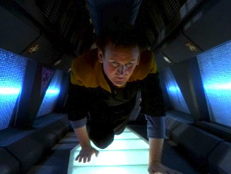 Trivial Note – The original story called for O’Brien to basically run through the plot of that Liam Neeson movie Unknown (several other movies use this plot, as well), where no one remembers who he is (it should be noted that Unknown was made well after this). This angle was difficult to develop, so instead the story changed to a conspiracy theory (a la the film The Parallax View, among other examples). There is no B-plot, as the story’s nature necessitated that it develop entirely from the Chief’s POV. This caused the episode to run short, so the in media res aspect of the story was introduced. A scene where O’Brien sings “The Minstrel Boy”, a big part of his backstory from TNG, was added to pad the episode out, but then had to be cut due to a too-late-to-be-fixed error involving the names of the runabouts used in the scene. The term “replicant” is used for the O’Brien double, as a reference to the classic film Blade Runner and because the term had never been used in Trek before.