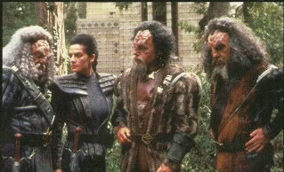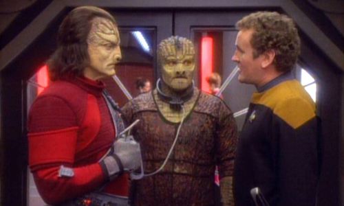 Trivial Note – While they play the same characters, all three of the returning Klingons masters look and act differently than they did on TOS. The difference in behavior can easily be attributed to age, as aging Klingons soon become a significant part of the series in general. The difference in appearance is obviously due to the makeup overhaul the Klingons underwent between TOS and the film series. DS9 never fully addresses this (in any of the Kor episodes, nor in “Trials and Tribble-ations” when both types of Klingons are seen), which is for the best. Enterprise later cooked up an in-universe explanation, which only served to confuse matters further.
