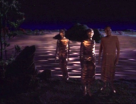 Trivial Note – Everyone involved with the production downplayed the lesbian nature of Dax and Kahn’s relationship, insisting that it was about love in the face of a societal taboo (in this case, the Trill taboo about interacting with people from the lives of a past host). This is one of four instances where a regular character gets a chance to somehow rekindle an old romance that was cut short by a death. Sisko reconnects with Jennifer, his dead wife’s Mirror Universe doppelgänger, in “Through the Looking Glass” and “Shattered Mirror”. Dax and Kahn nearly fall back in love here. Kira and Mirror Bareil have a short romance in “Resurrection”, and Worf and Ezri make love in “Penumbra”. As you’d expect, none of these work out very well.