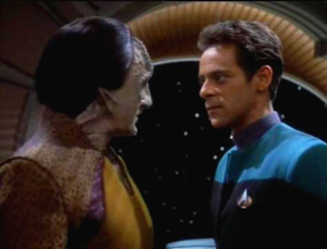 Trivial Note – Several things – this episode finally fully explains the mistake Bashir made at Starfleet Medical that kept him being valedictorian of his class (introduced in “Q-Less” and brought back up in “Distant Voices”). Bashir’s mistake was intentional, as he didn’t want anyone to grow suspicious of his abilities. Originally, the script called for O’Brien to help Bashir keep his secret, but Alexander Siddig requested that the truth come to light, as he didn’t want to play Bashir with a secret in future episodes. Robert Picardo crosses over from Voyager to play Dr. Zimmerman and the Emergency Medical Hologram. The actress who plays Bashir’s mother is named Fadwa El Guindi, and she’s really an anthropologist and a noted spokeswoman for Arab-Americans. This is her only professional credit, but her speech at the end defines the episode. Finally, in the Rom-Leeta-Zimmerman B-plot, we both find out about Rom’s ex-wife (and Nog’s mother) Prinadora for the first time, and we see Rom and Leeta finally become a couple. There are several more, but I’ll leave them for you to read about on your own.