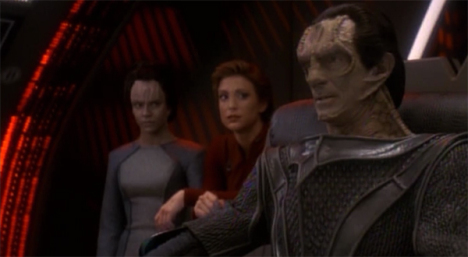 Trivial Note – While Dax snidely made sure Capt. Keogh had evacuated all non-essential personnel before heading into the Gamma Quadrant, a lot of people get blowed up in the final battle. You’d think we’d hear more about this in the future, but we really don’t. (Trek had made this mistake before, like when over 1,000 people are killed in the teaser for TNG‘s “Contagion” and everyone promptly forgets about it.) The destruction of a ship of the same class as the Enterprise–D was an intentional move by the producers. This 1 – established how big and bad the Dominion was and 2 – scared TNG fans when they saw the explosion in the teaser ads for this episode. The Jem’Hadar personal cloaking device uses the same visual effect as the cloak that Tosk used in “Captive Pursuit”. Writer Robert Hewitt Wolfe came up with an unused backstory that claimed the Dominion genetically engineered the Tosk for the Hunters, just as we later find that the Jem’Hadar and Vorta are genetically engineered. While sticking to the Changelings, Vorta, and Jem’Hadar helped focus things, it would’ve been nice if we’d seen any other Dominion races in the series (as far as I know, aside from the big three, we only ever see the Karemma).