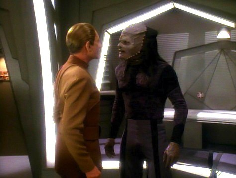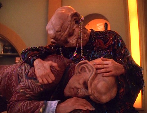 Trivial Note – The decision to make Rom Grand Nagus was made late in the game. Initially, Quark was to ascend to the post, a development that would be reminiscent of “The Nagus”, the season one episode where Zek first appears. Ira Steven Behr felt that Quark’s presence meant too much to the station, so Rom was tabbed as Nagus instead. The script went through a few rewrites to come up with a satisfactory way for that to happen. Part of Quark’s rant about the death of Ferengi culture includes the line, “The line must be drawn here! This far, no further!” This is a comic take on Capt. Picard’s line about the Borg in Star Trek: First Contact. Both this episode and that film were co-written by Ronald Moore. And finally, Jeffrey Combs appears as both of his recurring characters, Brunt and Weyoun, in this episode. This is the only time an actor plays two different aliens in the same episode in Trek history.