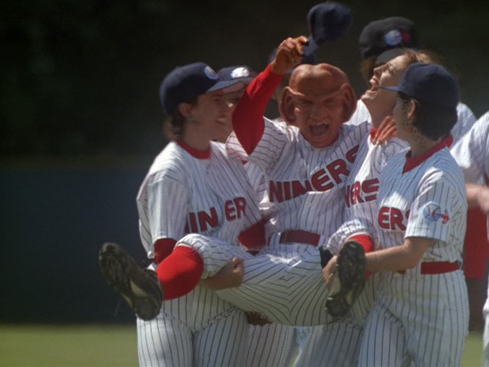Trivial Note – The script for this episode was largely based off an episode of Fame that Ira Steven Behr had written. Avery Brooks, Cirroc Lofton, Armin Shimerman, Aron Eisenberg, and Max Grodenchik were all more skilled at baseball than they let on in their performances. Humorously, Grodenchik was easily the best player of the group, though Rom, his character, was easily the worst. That’s why Rom is shown as left-handed, as Grodenchik would’ve appeared too natural at the game right-handed. Ernie Banks’ son Joey organized the team that portrayed the Vulcans and coached the DS9 actors. (Ernie, of course, is a baseball legend.) The weird symbols on the back of the Vulcan uniforms are supposed to be the players’ names written in Vulcan, which had never been depicted on screen before as far as I know. Also, this episode marks the only time the Federation’s anthem is ever heard on screen. That you hear it at the only team sporting event depicted in the franchise and not any of the numerous official government functions we see is deeply amusing to me. (Where are you most likely to hear the anthem in the present day? A stadium.)