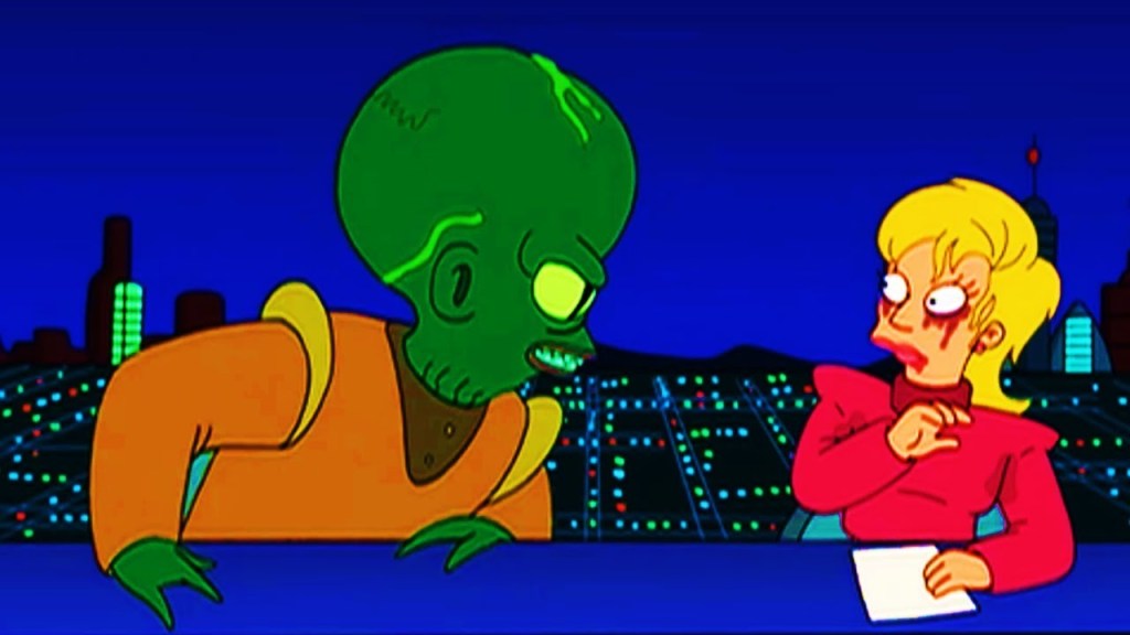 The series’ pilot episode, 1999’s “Space Pilot 3000”, succeeded in many areas. It established the show’s main trio (Fry, Leela, and Bender), plus it generally introduced us to the tongue-in-cheek vibe of New New York and the year 3000. The “world of tomorrow” bit from this article’s title is also lifted straight from the first words Fry hears when his cryonic tube opens. Plus, we get hints of two of the show’s longest-running threads – the alien language and the shadow under the desk at the cryonics lab. (It feels weird using “cryonics” and not “cryogenics”, but cryonics is technically correct, the best kind of correct.) But the gag that feels the most representative to me of the show’s humor is the one that plays out while Fry is frozen. I can’t put my finger on why, but I never fail to laugh when the flying saucers destroy everything, a new world is slowly rebuilt, and then the same flying saucers come back and destroy everything again. That’s just classic comedy.
