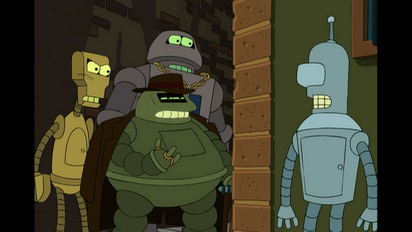 Following on from that, while the roster of regular characters is strong (Bender and Professor Farnsworth are lovably evil in their own ways and Dr. Zoidberg is a true one-of-a-kind), it’s often the random side characters who steal the show. There’s again a nearly endless amount of them – Morbo, Lrrr and Nd-Nd, Zapp and Kif, Nixon’s head, Mom and her three idiot sons, Roberto, Tinny Tim – but the Robot Mafia may have the highest batting average of the lot. The word “clamp” will never be the same, and the underplaying of most of the lines delivered by the Donbot and Joey Mousepad (both voiced by John DiMaggio) always makes those lines land a little harder. (Explaining this joke to someone who hasn’t seen it is impossible, which is sad because it’s one of my favorites in the whole series.)